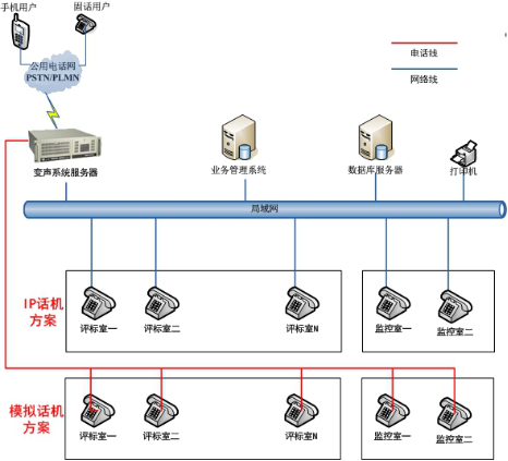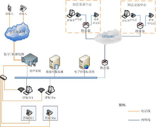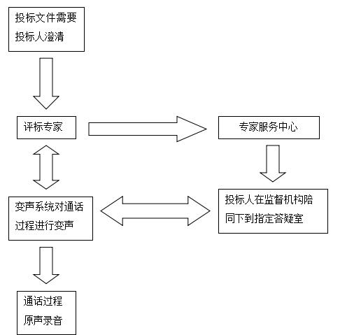 评标室内放置变声系统终端设备,可采用普通话机,亦可采用专业电话会议专用话机,推荐使用专业的电话会议专用话机,通话和收听效果好。答疑电话可使用普通电话、IP电话或直接呼叫投标人电话。